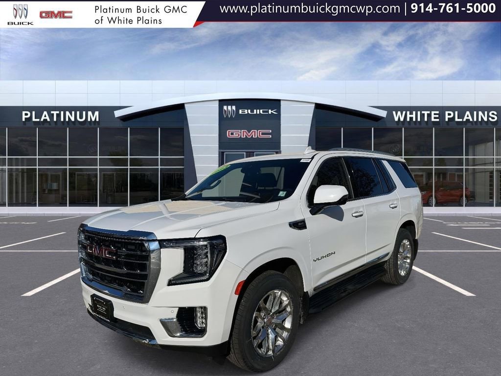 Certified. Summit White 2023 GMC Yukon SLT 4WD 10-Speed Automatic with Overdrive EcoTec3 5.3L V8 GMC CERTIFIED PRE-OWNED, 4WD, 2 Presets For Outside Rearview Mirrors, 2 Presets For Power Driver Seat, 3rd Row 60/40 Power-Folding Split-Bench Seat, 3rd row seats: split-bench, 4-Wheel Disc Brakes, 9 Speakers, ABS brakes, Adaptive Cruise Control, Air Conditioning, Alloy wheels, AM/FM radio: SiriusXM with 360L, Apple CarPlay/Android Auto, Auto High-beam Headlights, Automatic temperature control, Bose 9-Speaker Stereo Audio System Feature, Brake assist, Bright Chrome Bodyside Moldings, Bright Front & Rear Door Sill Plates, Chrome Door Handles w/Body-Color Strip, Delay-off headlights, Dual front impact airbags, Dual front side impact airbags, Electronic Stability Control, Emergency communication system: OnStar and GMC connected services capable, Enhanced Automatic Emergency Braking, Four wheel independent suspension, Front & Rear Park Assist, Front anti-roll bar, Front Bucket Seats, Front dual zone A/C, Front fog lights, Fully automatic headlights, Hands-Free Power Programmable Rear Liftgate, HD Surround Vision, Heated & Ventilated Driver & Front Passenger Seats, Heated 2nd Row Outboard Position Seats, Heated Driver & Front Passenger Seats, Heated front seats, Heated Steering Wheel, Inside Rear-View Auto-Dimming Mirror, License Plate Front Mounting Package, Low tire pressure warning, Memory seat, Navigation System, Occupant sensing airbag, Outside Heated Power-Adjustable Mirrors, Overhead airbag, Panic alarm, Perforated Leather-Appointed Seating, Power driver seat, Power Liftgate, Power passenger seat, Power Release 2nd Row 60/40 Split-Folding Bench Seat, Power steering, Power Tilt & Telescopic Steering Column, Power windows, Preferred Equipment Group 4SA, Premium Smooth Ride Suspension, Rear air conditioning, Rear anti-roll bar, Rear Pedestrian Alert, Rear window defroster, Remote keyless entry, Safety Alert Seat, Security system, SiriusXM w/360L, SLT Luxury Package, Speed control, Speed-sensing steering, Steering wheel mounted audio controls, Traction control, Universal Home Remote, Ventilated front seats, Wheels: 20 x 9 6-Spoke Polished Aluminum, Wireless Charging.